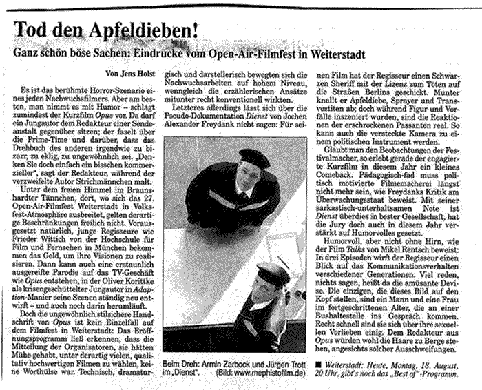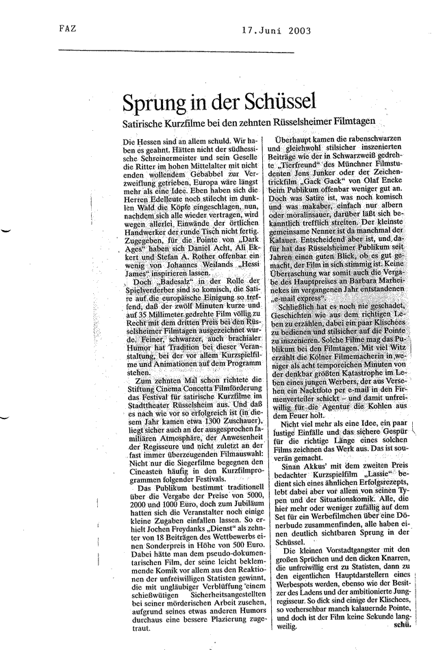 | 17.06.2003: Artikel in der Tageszeitung "Frankfurter Allgemeine Zeitung" (über die 10. Rüsselsheimer Filmtage, DIENST bekommt Sonderpreis) |