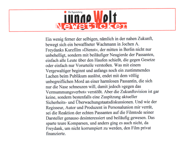 DIENST läßt die Grenzen zwischen Fiktion und Realismus verschwinden. Teilweise wurde mit versteckter Kamera gearbeitet, um wirklich authentische Reaktionen von Passanten zu bekommen. Mitunter waren wir selbst erschrocken, wie die Menschen reagierten.Jochen Alexander Freydank, Regisseur |